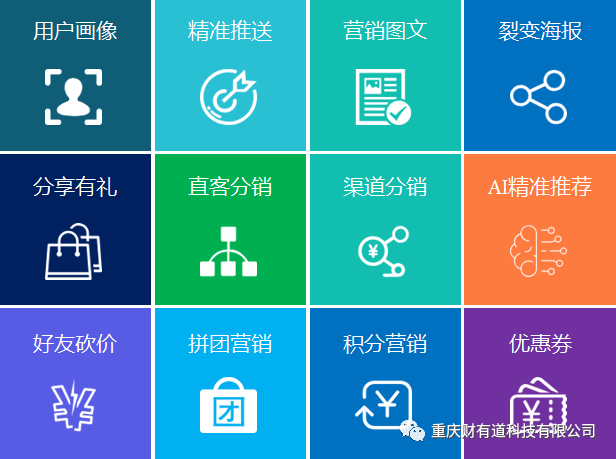 包括了用户画像、精准推送、营销图文、裂变海报、直客分销、分享有礼、渠道分销、拼团营销、好友砍价、积分营销等10余项营销插件进行引流、裂变、营销